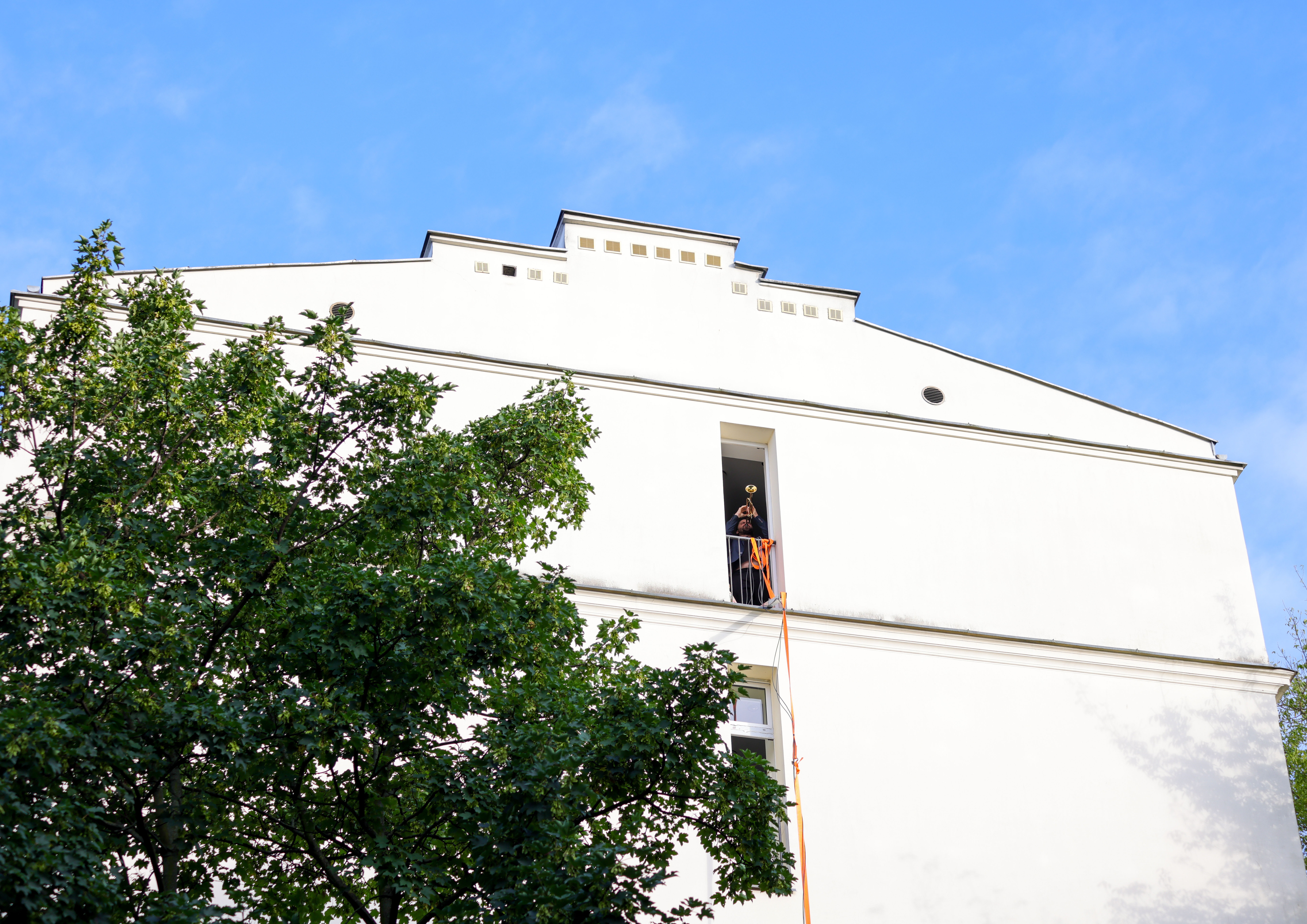 Wieczór rozpoczął się muzyką – zamiast tradycyjnego przecięcia wstęgi, ze słynnego mieszkania przy ul. Rozbrat popłynął hejnał zagrany przez Piotra Damasiewicza i Macieja Obarę. Ich improwizowane dźwięki wypełniły przestrzeń między oknami domu Stańki a nowo otwartym skwerem, łącząc symbolicznie te dwa miejsca – prywatne i publiczne, osobiste i wspólne.